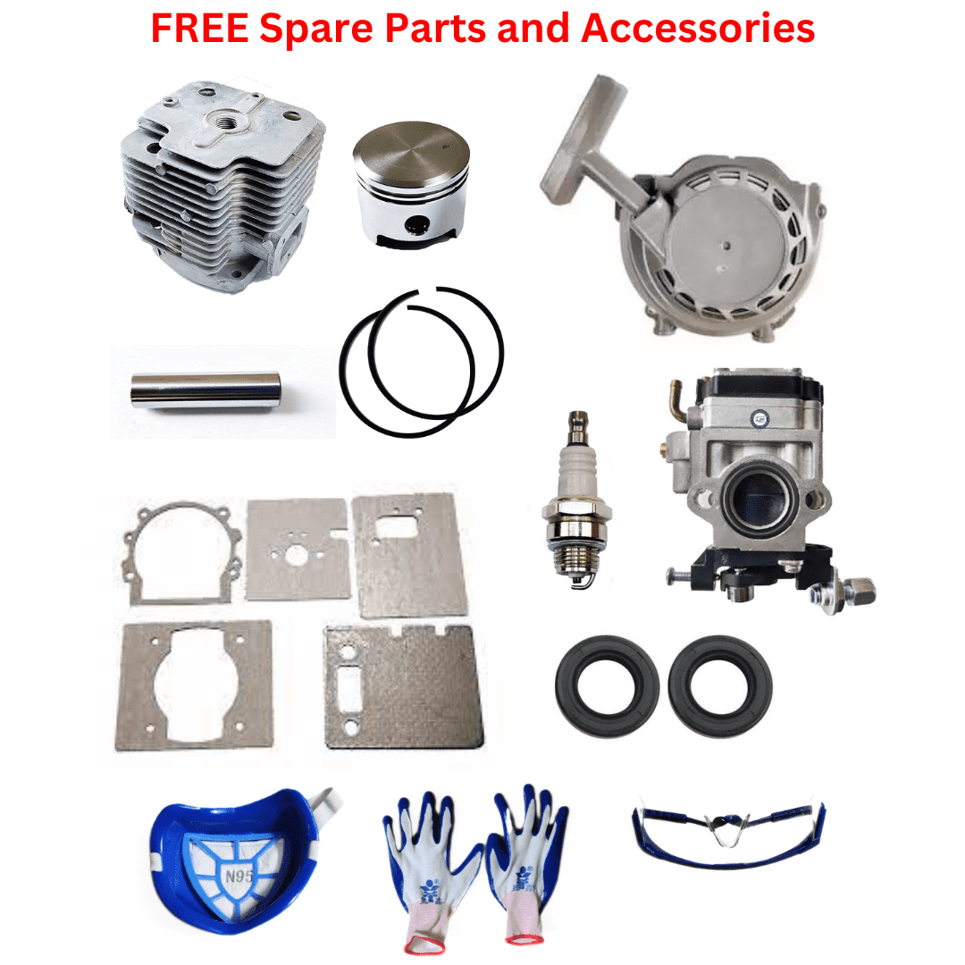| Free Spare Parts | Spark Plug, Oil Set Set, Piston Ring Set, Recoil Starter, Safety Goggles, Hand Gloves and Safety Mask |