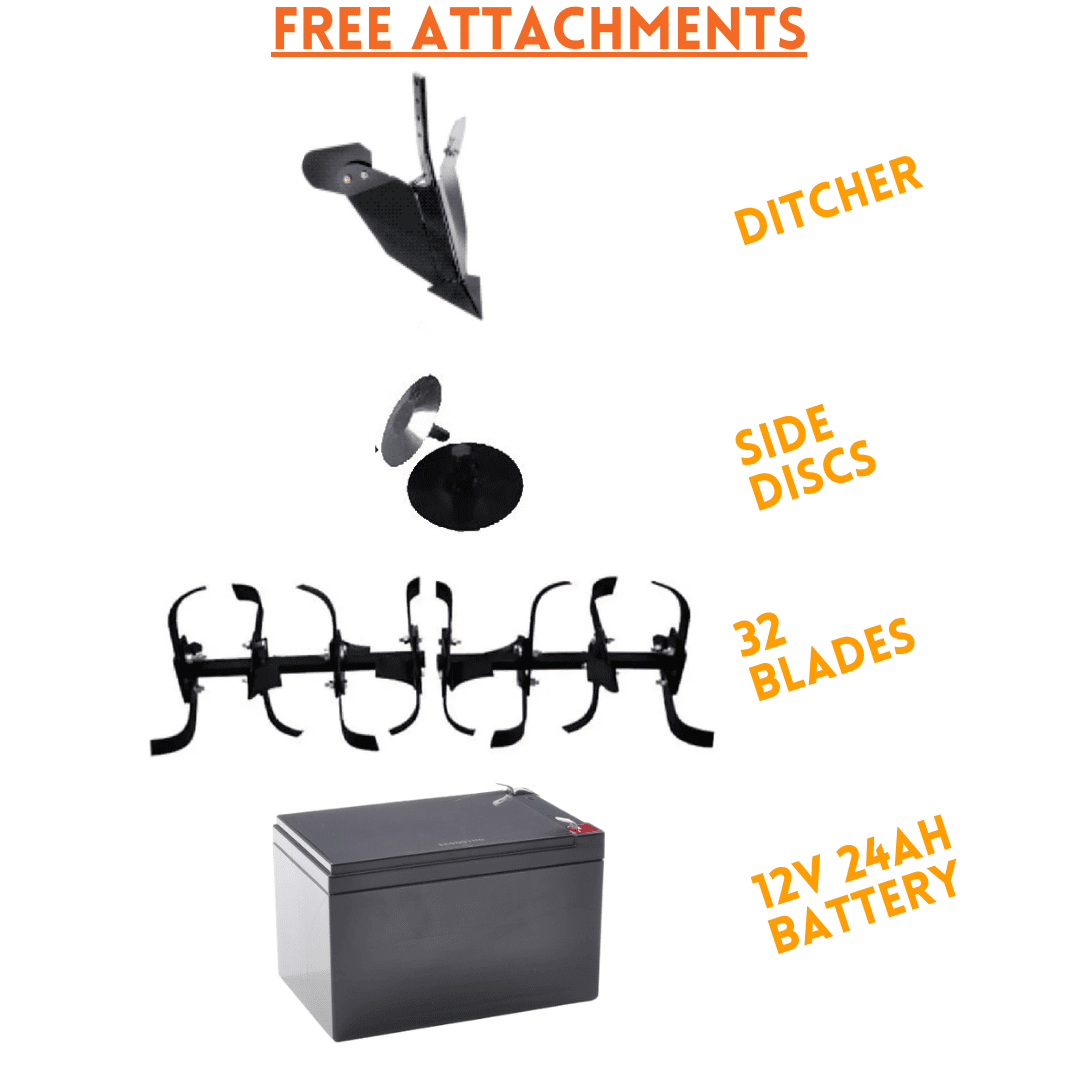 | Attachments Included | 32 Blades, 2 Tyres, Side Discs, Adjustable Ditcher Ridger |