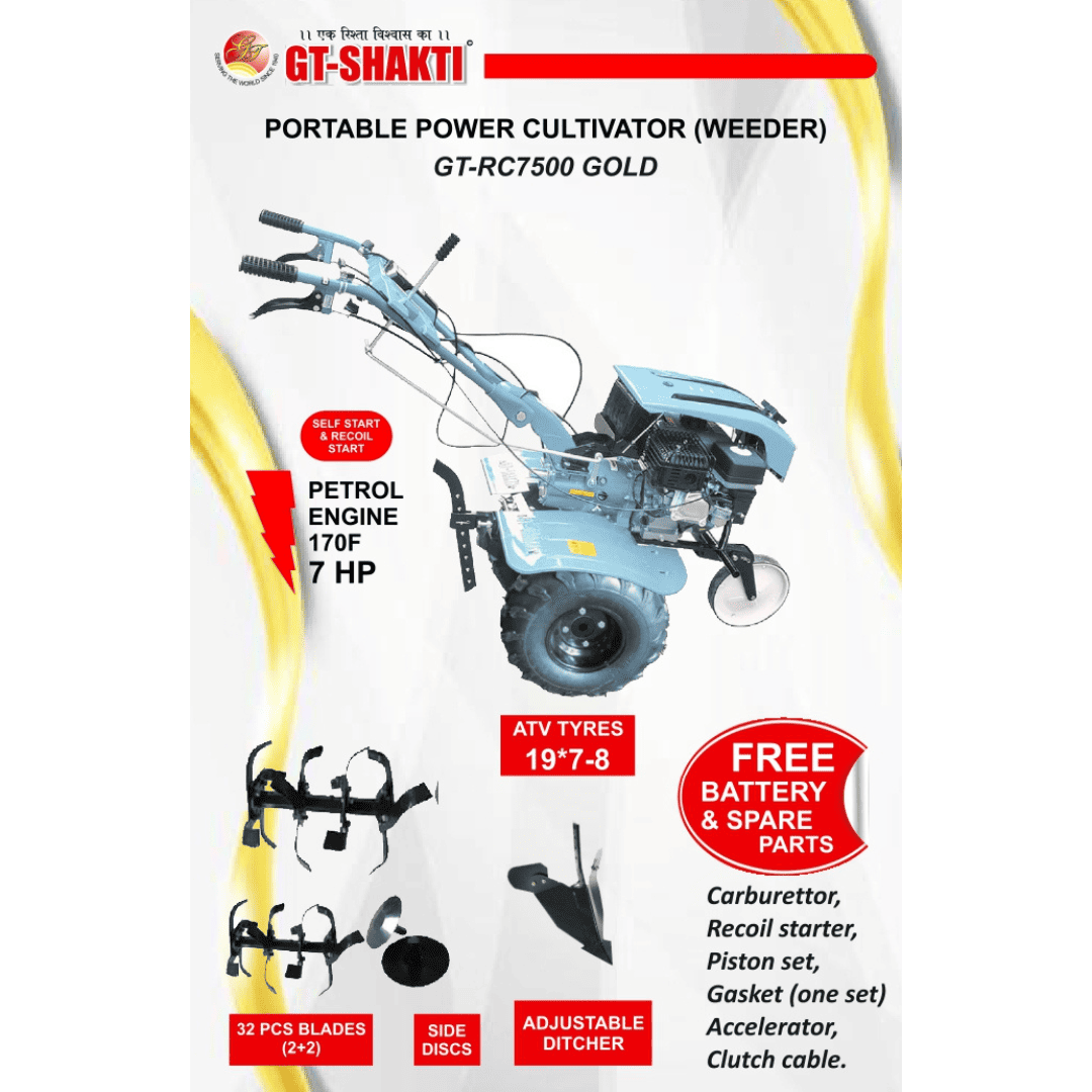 The GT Shakti GT-RC7500 Gold is a powerful 7 HP Self-Start Power Weeder designed for efficient soil preparation, weeding, and tilling. With its self-start mechanism, PTO shaft compatibility, and large ATV tyres, this machine ensures superior performance and ease of use on different terrains.