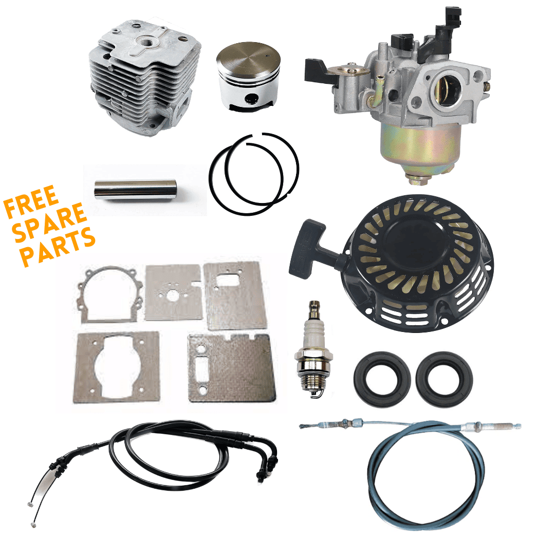 | Spare Parts Included | Free Battery, Carburettor, Recoil Starter, Piston Set, 8 pcs Gasket Set, Accelerator Cable and Clutch Cable |