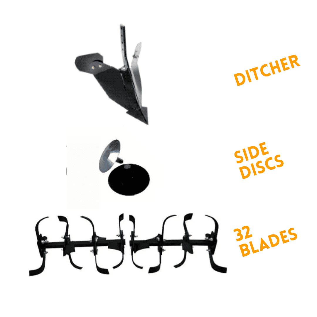| Attachments Included | 32 Blades, 2 Big ATV Tyres, Side Discs & Adjustable Ditcher Ridger |