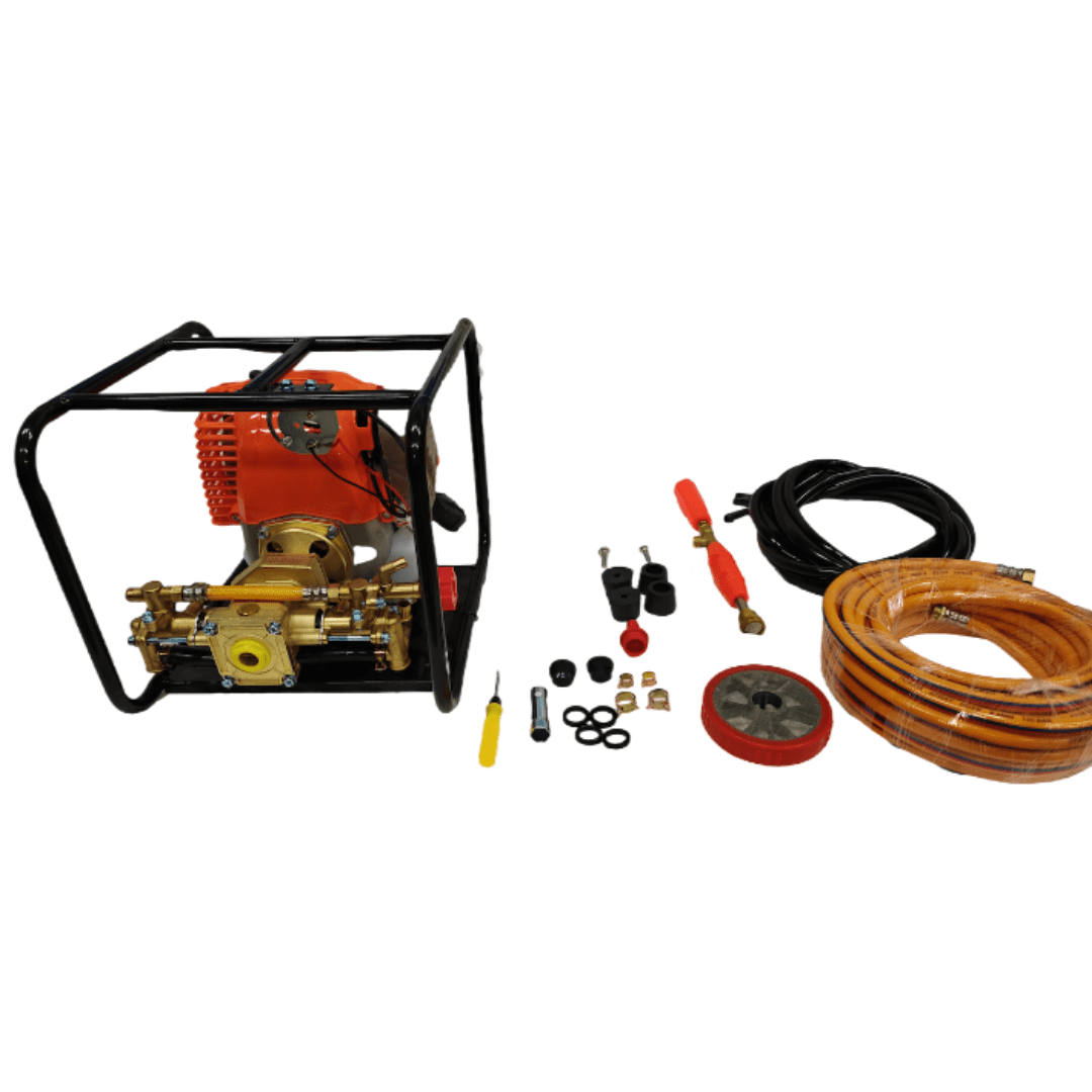 - Free 15-metre hose pipe, a 30 cm brass gun, a suction pipe with a filter, and a tool kit