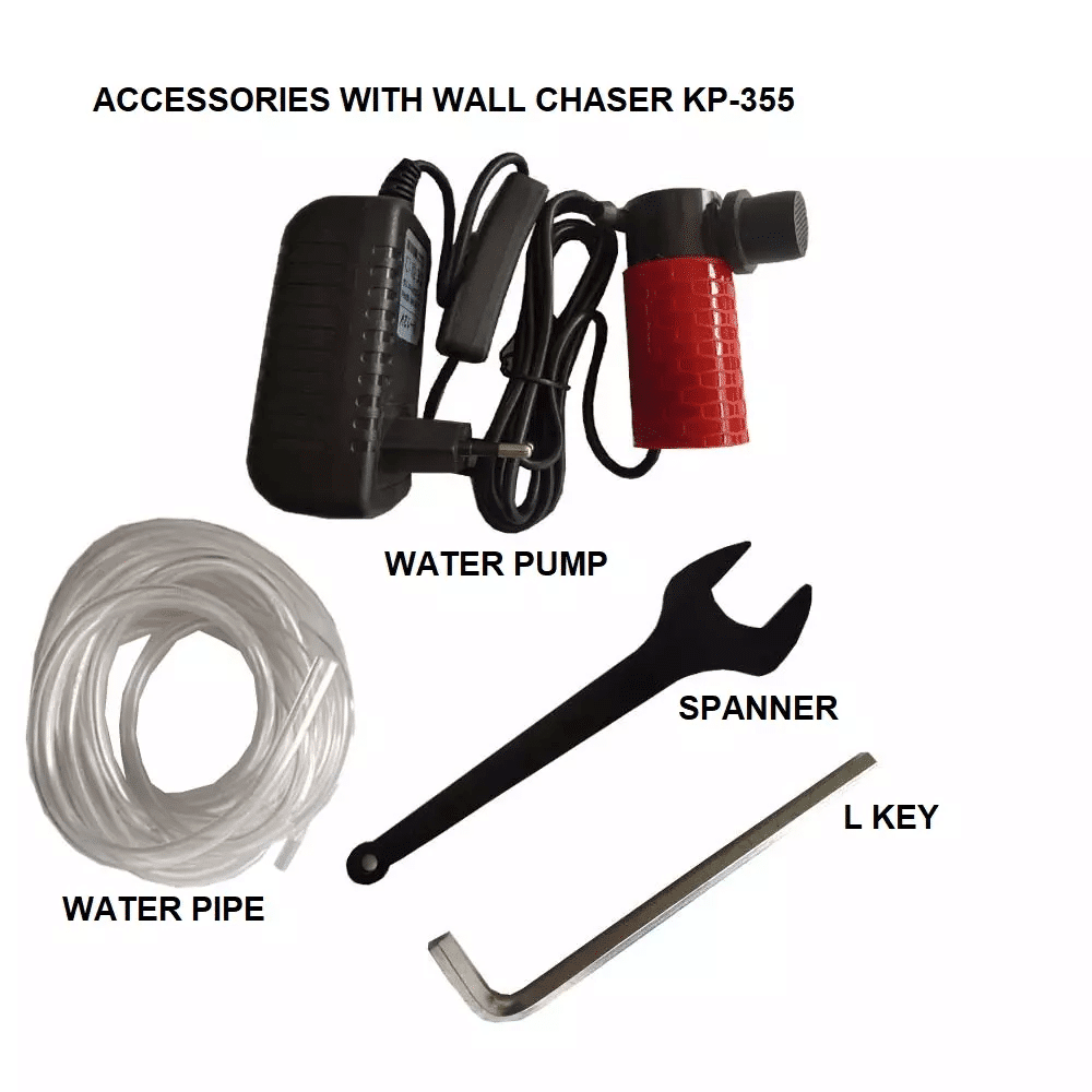 | Includes | 1) WALL CHASER MACHINE WITH 5 BLADES. 2) WATER MOTOR. 3)PIPE, L KEY, SPANNER, T JOINT |