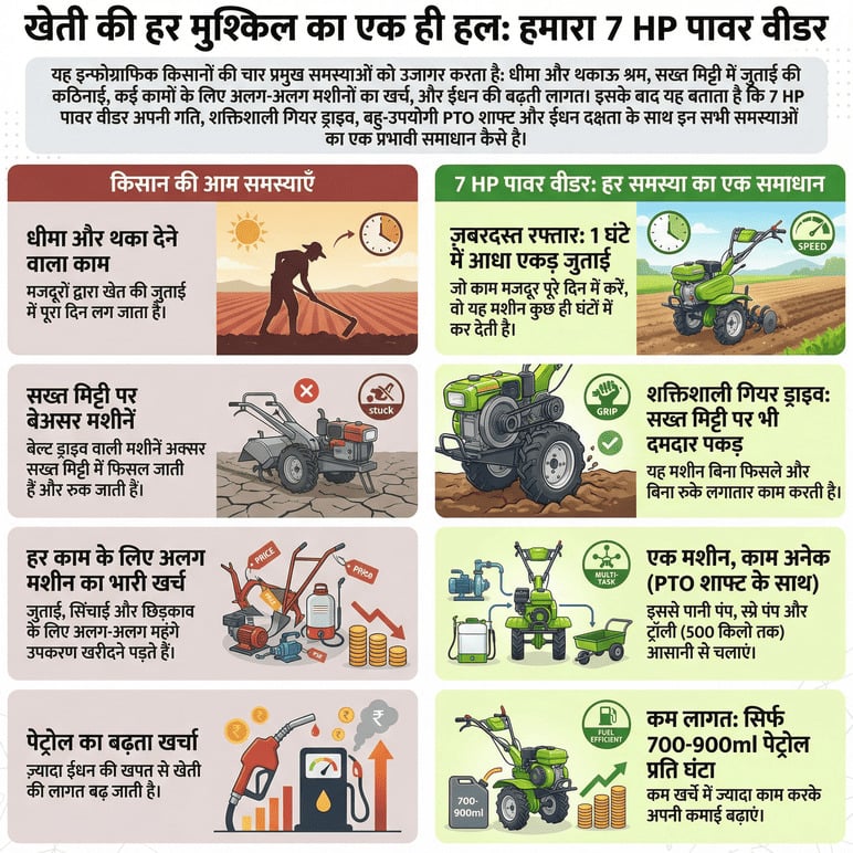 A: Ji haan. Isme 7 HP ka powerful engine aur Gear Drive system hai. Belt wali machine sakht mitti mein fisal jati hai, lekin ye Gear Drive machine bina rukey sakht mitti ki jutaai kar sakti hai.