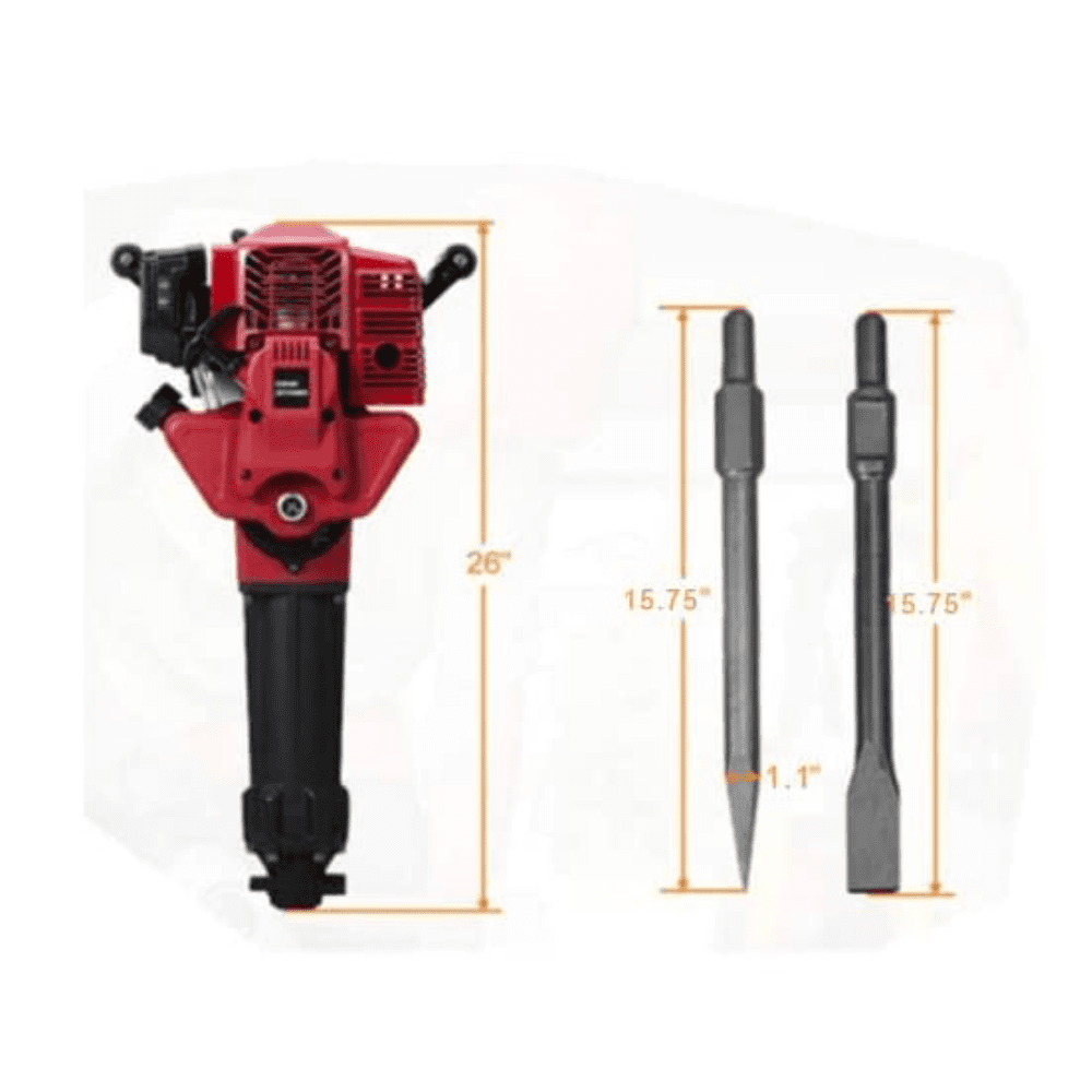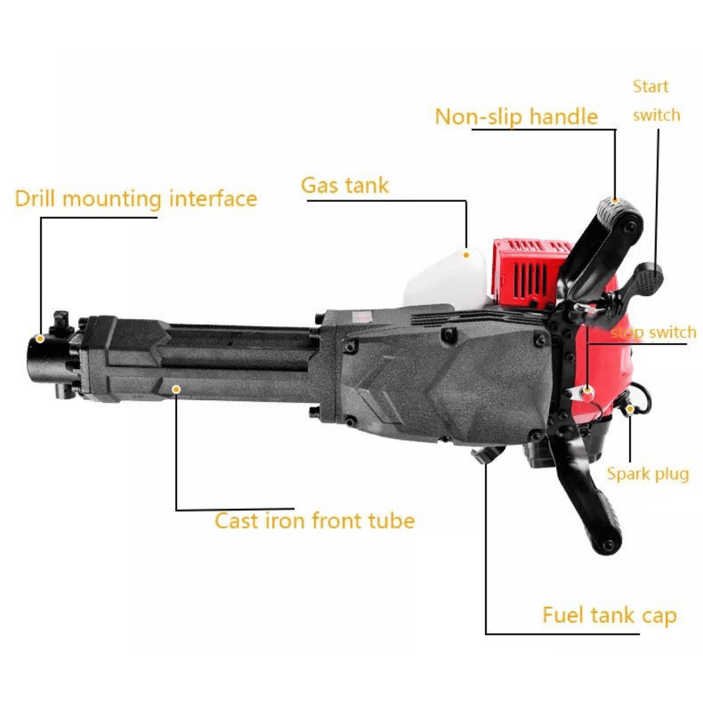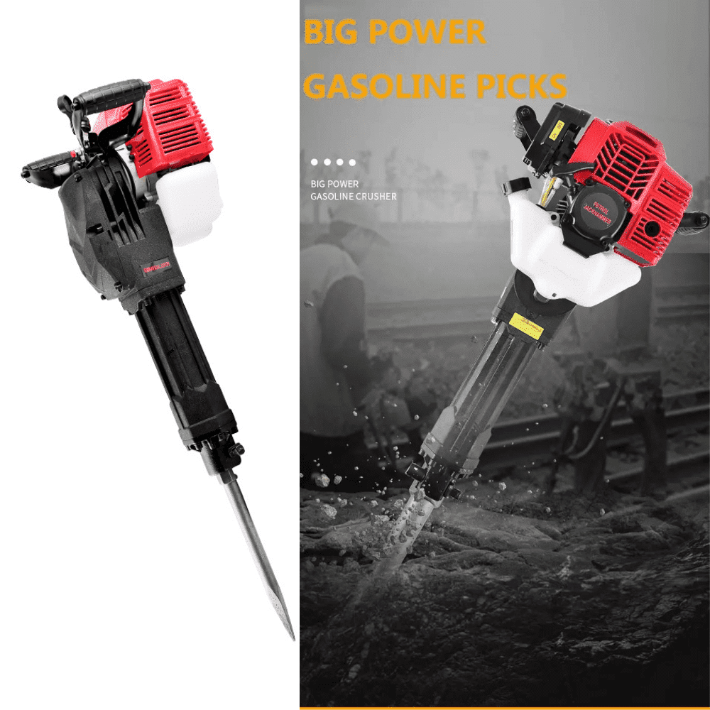 Built to withstand the toughest environment, the Power Gold 52CC Petrol Jack Hammer Demolition Hammer AG-JH95A comes with a powerful 2.0 HP engine for added performance and longer tool life. It is an extremely versatile tool that can be used for breaking concrete, removing asphalt, digging holes and much more. It is specially designed to meet the demands of contractors and construction professionals who need a durable and efficient machine. Its rugged design and high power allow you to complete the toughest jobs. It weighs only 16 kg and is easy to transport from place to place. The tool comes with adjustable rear handle, a low kickback head and a variable speed trigger for added efficiency. Its variable speed control dial helps you regulate the power output, making it easy to use on a wide range of materials. It also comes with an oil sight, fuel level indicator and a filtration system.