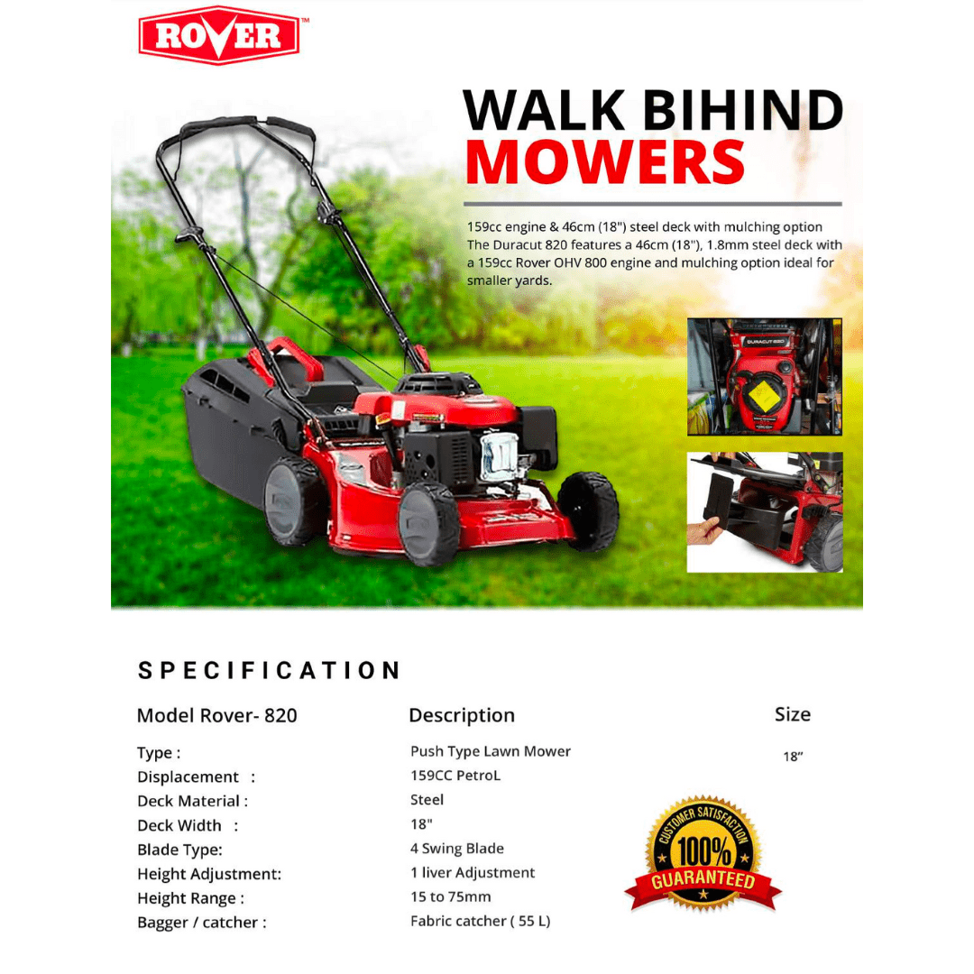 Experience the ease and efficiency of the ROVER Petrol Lawn Mower, your go-to tool for maintaining a beautifully landscaped lawn. Make lawn care a breeze with this reliable ROVER Duracut-820 lawn mower. Order yours today and discover the convenience and effectiveness of this exceptional lawn maintenance tool.