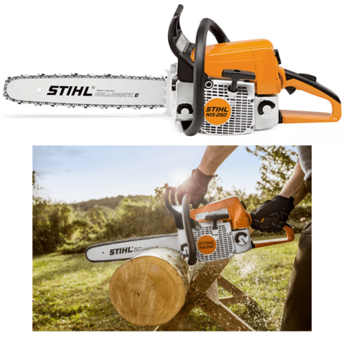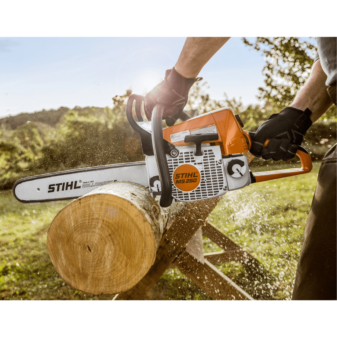 The STIHL MS250 petrol chainsaw is a powerful and reliable tool that is designed for cutting firewood, felling trees, and tackling a variety of other outdoor tasks. It is powered by a high-performance petrol engine that delivers strong and consistent power, and is equipped with a 20-inch bar and chain that can easily cut through branches and logs. The chainsaw has a lightweight and compact design that makes it easy to handle and maneuver, and is equipped with a variety of features that help to ensure safe and efficient operation. These features include an automatic chain lubrication system, a quick chain tensioning system, and an anti-vibration system that helps to reduce fatigue during prolonged use. The chainsaw is suitable for a wide range of applications, and is perfect for homeowners, landscapers, and professional loggers.