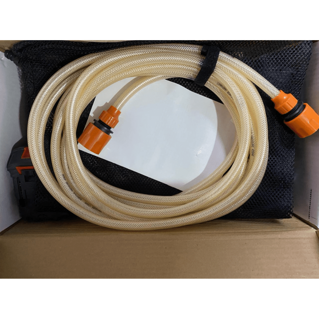 - Package Contents: Pressure Washer Gun, 21 Volt Lithium Ion Battery Pack, Battery Charger, Inlet Hose with Filter, Pressure Rod and Outlet Connector